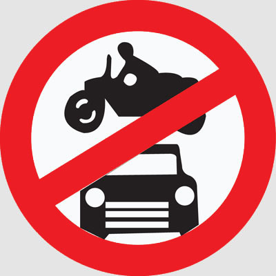 No power-driven vehicles are allowed beyond this point. This includes cars, trucks, scooters, and motorbikes. | all motor vehicles prohibited Entry for all motor vehicles is prohibited |
