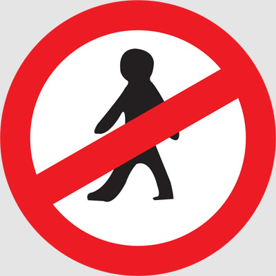 People are strictly forbidden from walking on or crossing the road beyond this point | pedestrians prohibited Pedestrians are prohibited from entering this road. |